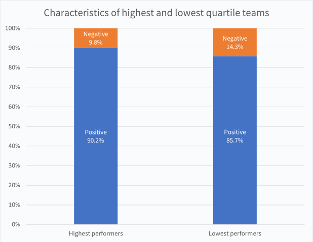 As was the case with the managers, the ratio of observed strengths to weaknesses was more favourable for the high-performing teams: 90.2%:9.8% for the top quartile, compared to 85.7%:14.3% for the bottom.